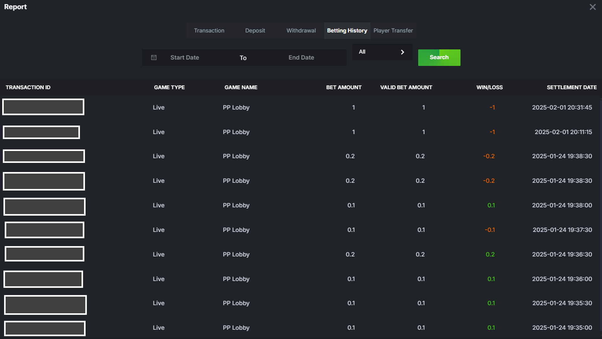 To access Betting History, simply log in to your XTRONBET account and go to the "Report" or "Betting History" page. There, you can input a start date and end date to filter the bets you want to view.