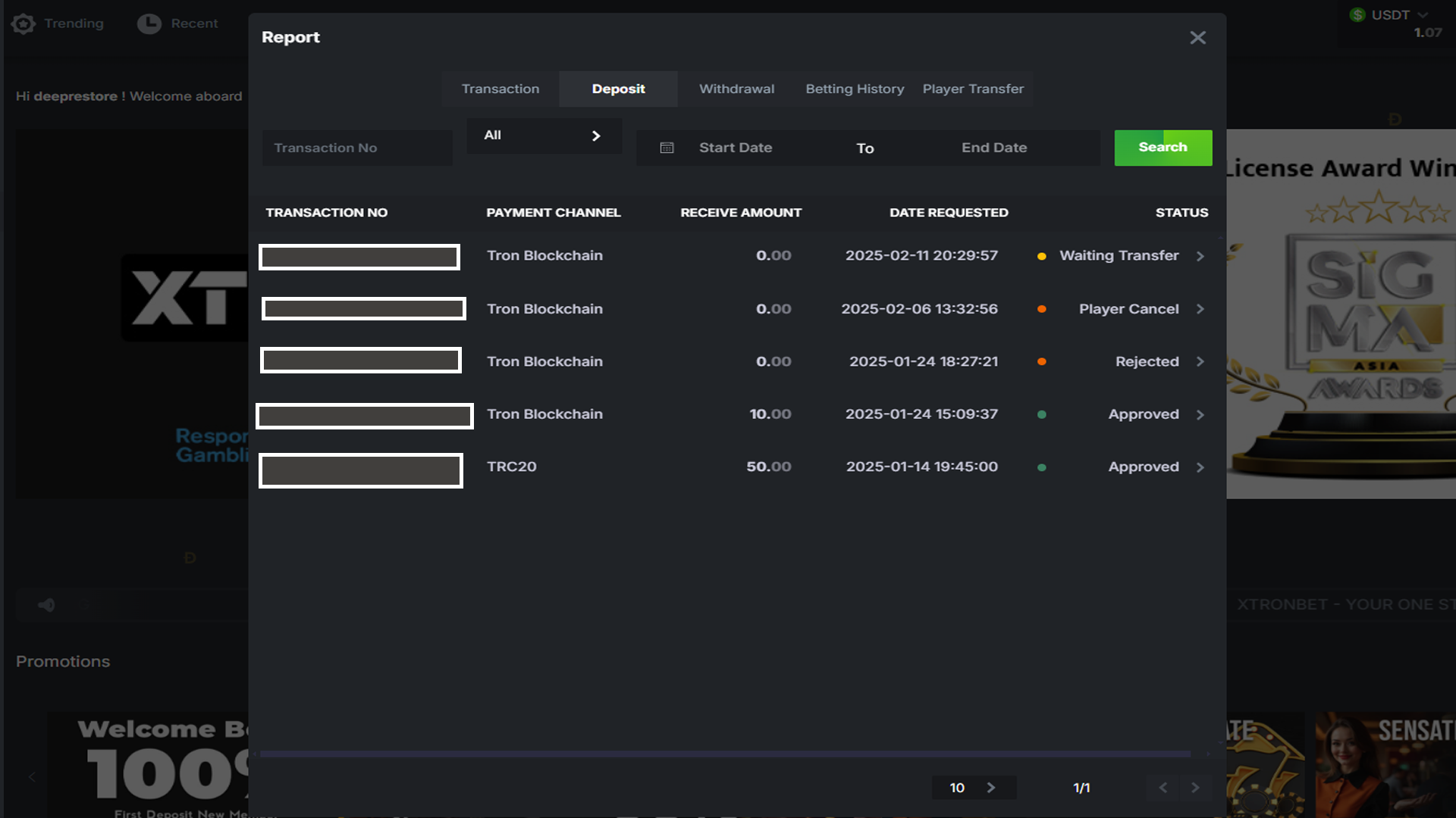 Deposit and Withdrawal Report is a feature that allows players to view details of all the deposit and withdrawal transactions they have made on XTRONBET. This report includes information such as transaction numbers, amounts received or requested, payment channels, transaction status, and the date of request.