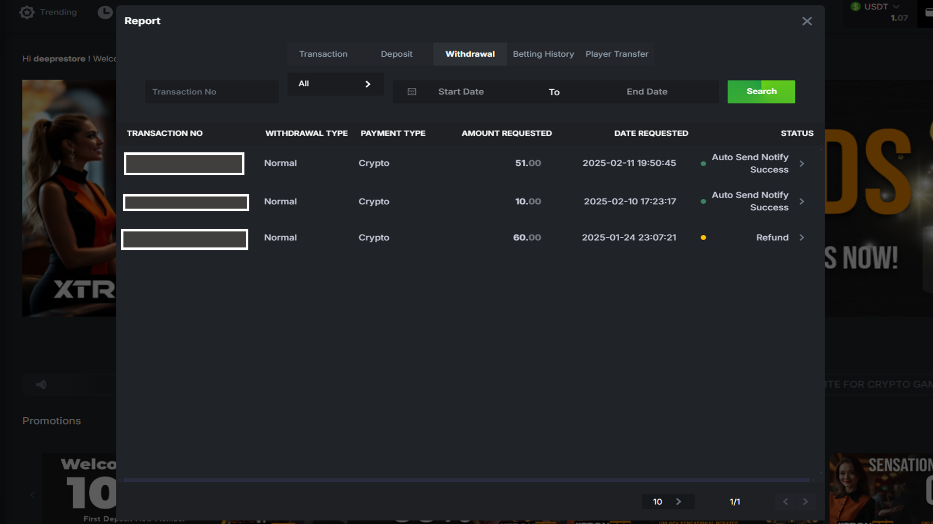 - Transaction No: D42025xxxx - Withdrawal Type: Normal - Payment Type: Crypto - Amount Requested: 60.00 - Status: Refund - Date Requested: 2025-01-24 23:07:21
