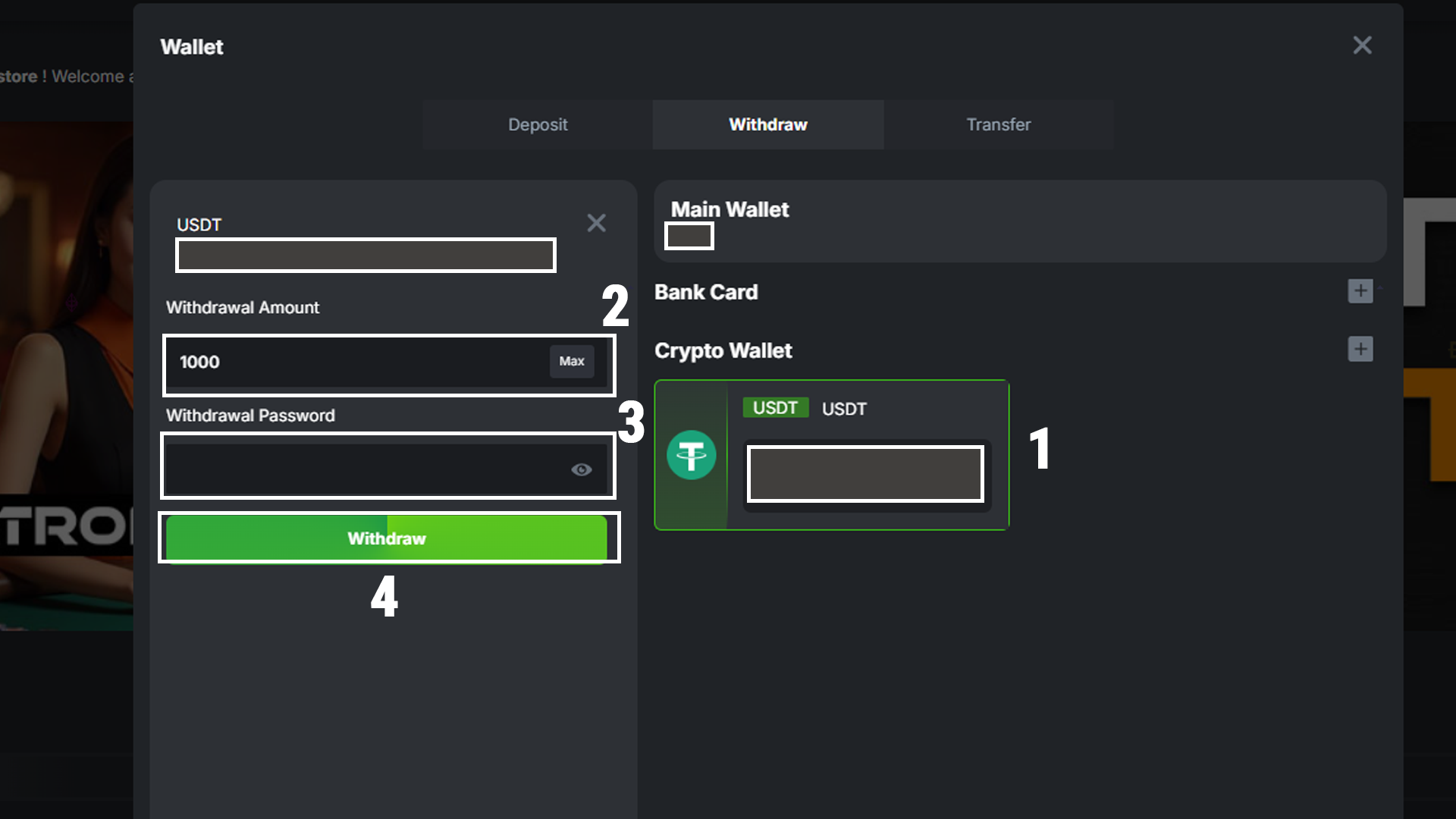 Before making a withdrawal transaction, ensure you have registered your crypto wallet or bank card and have set up your Withdrawal Password beforehand.